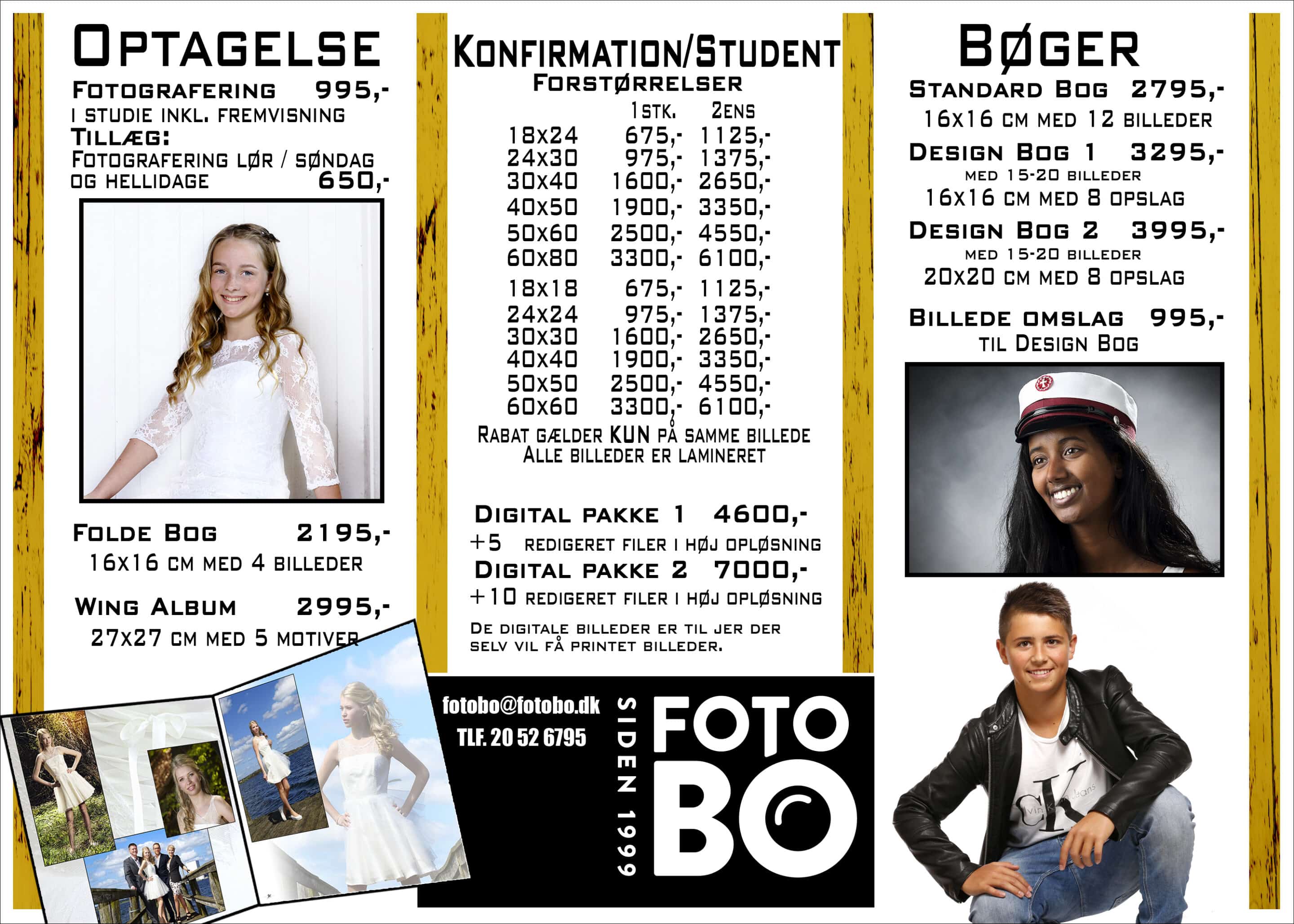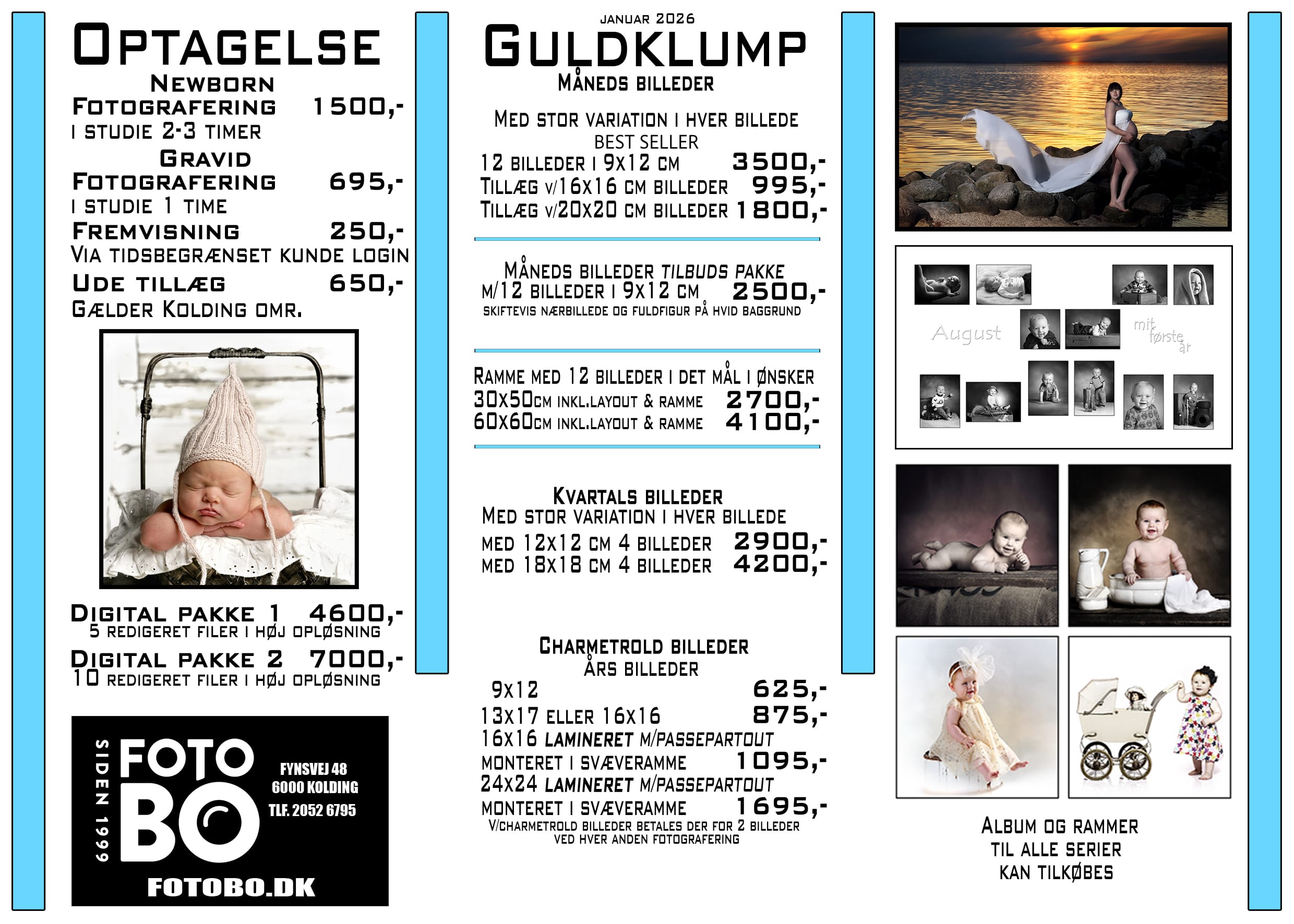 Her på mine prislister kan I få en fornemmelse af hvor mine priser ligger. Ønsker I, ligesom de fleste af mine kunder; et special tilbud. Vil jeg meget gerne tage en snak med Jer omkring dette. Det kan være et bestemt type billede, der skal hænge på væggen lige over en reol. Eller måske ønsker I billedet taget on-location ( på godt Dansk – ude et sted, der måske har en særlig betydning for Jeres familie) Jeg tager opgaver ind fra hele landet, så ingen udfordring er for stor og ingen opgave for lille.